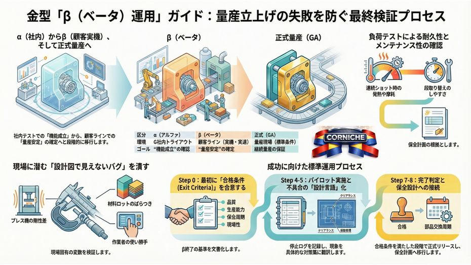 「本番生産環境でバグを炙り出す」ように、金型のβは**“現場の現実(生産現場の課題)”の中で量産安定性を確定**させます。
